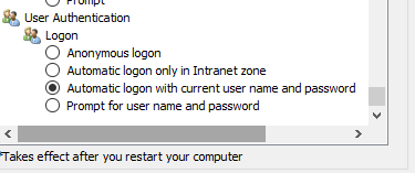 - Scroll down to the User Authentication section and select Automatic logon only in Intranet zone or Automatic login using current user and password. ( Both should work)