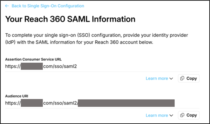 - On the Your Reach 360 SAML Information page, copy the Assertion Consumer Service URL and Audience URI, the 2 values will be used in their respective fields in step 5 in the RSA configuration section.