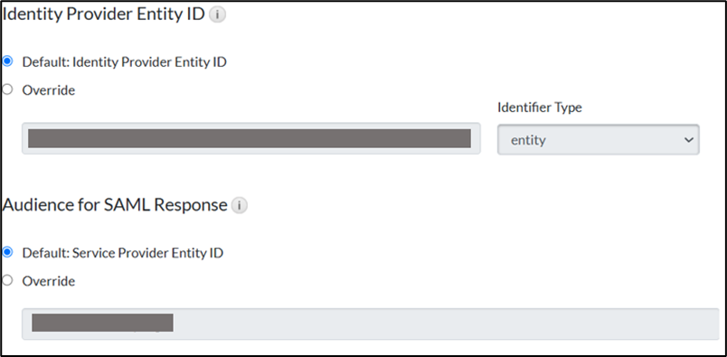 - Under Show IdP Advanced Configuration, Proceed with the Default option for Identity Provider Entity ID and Audience for SAML Response.