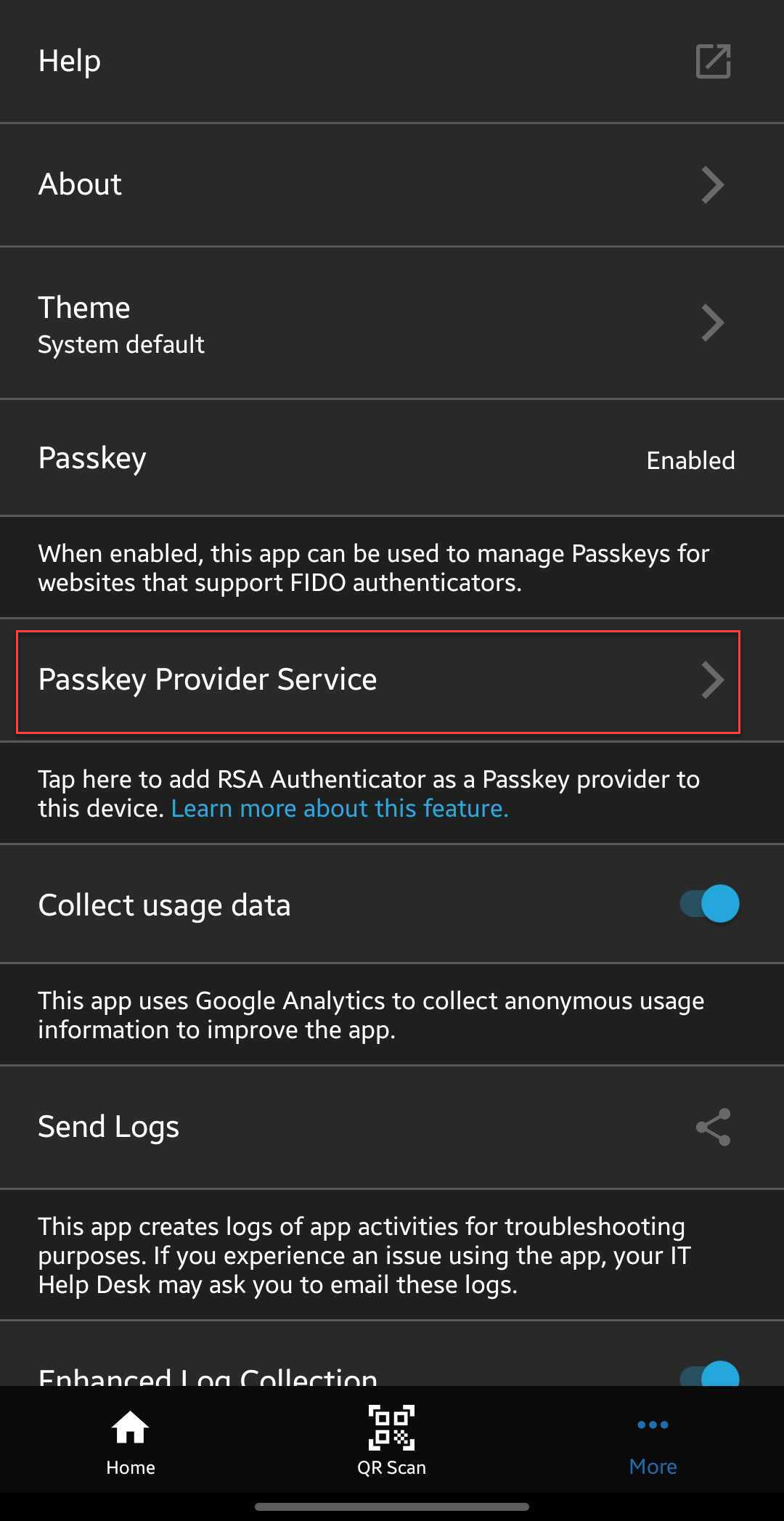 Alternatively, you can install the RSA Authenticator 4.5 app and tap the More option to check whether the passkey provider service is available or not.