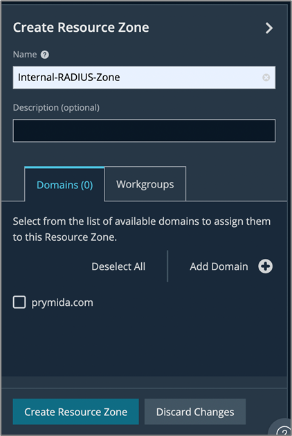 - Choose a name for the RADIUS Resource Zone and click Create Resource Zone. This will act as a logical group for the RADIUS traffic and will later be associated with a Resource Broker.