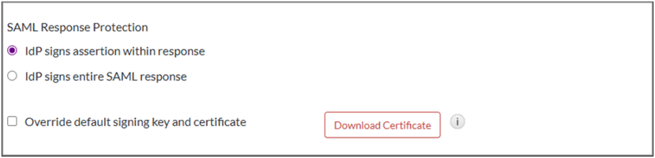 - Under the Message Protection section, choose IdP signs assertion within response.
