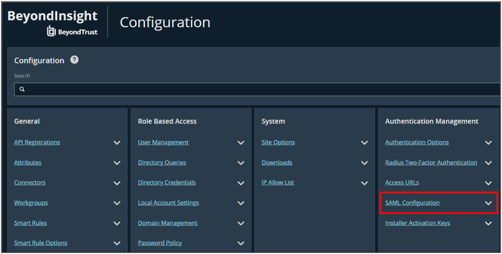 - Under Authentication Management, click SAML Configuration.