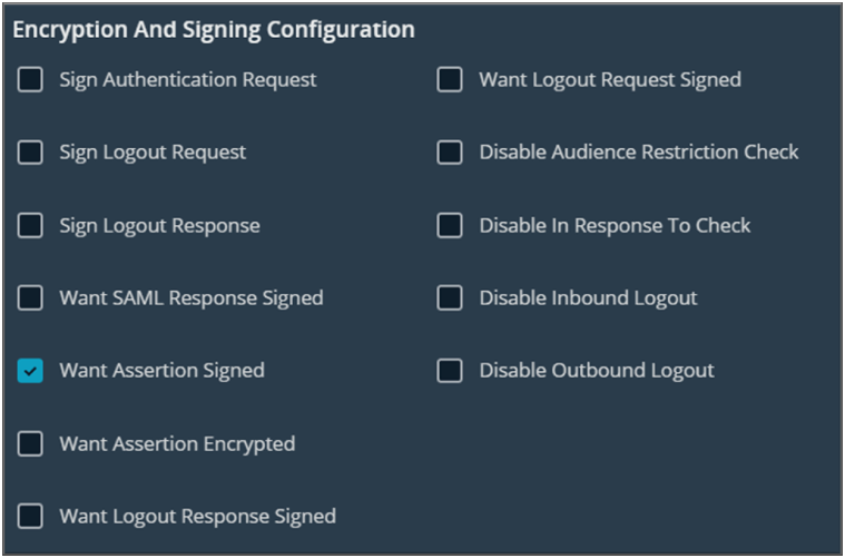 - Encryption and Signing Configuration: Select the applicable checkboxes to enable options, as required by your service provider.