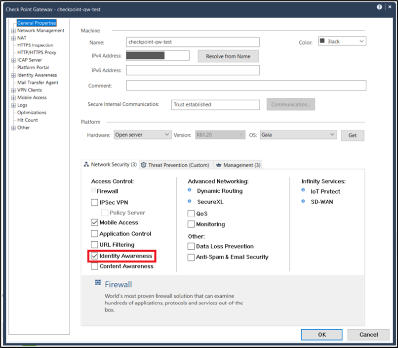 - In the General properties of the gateway, ensure that Identity Awareness is enabled.