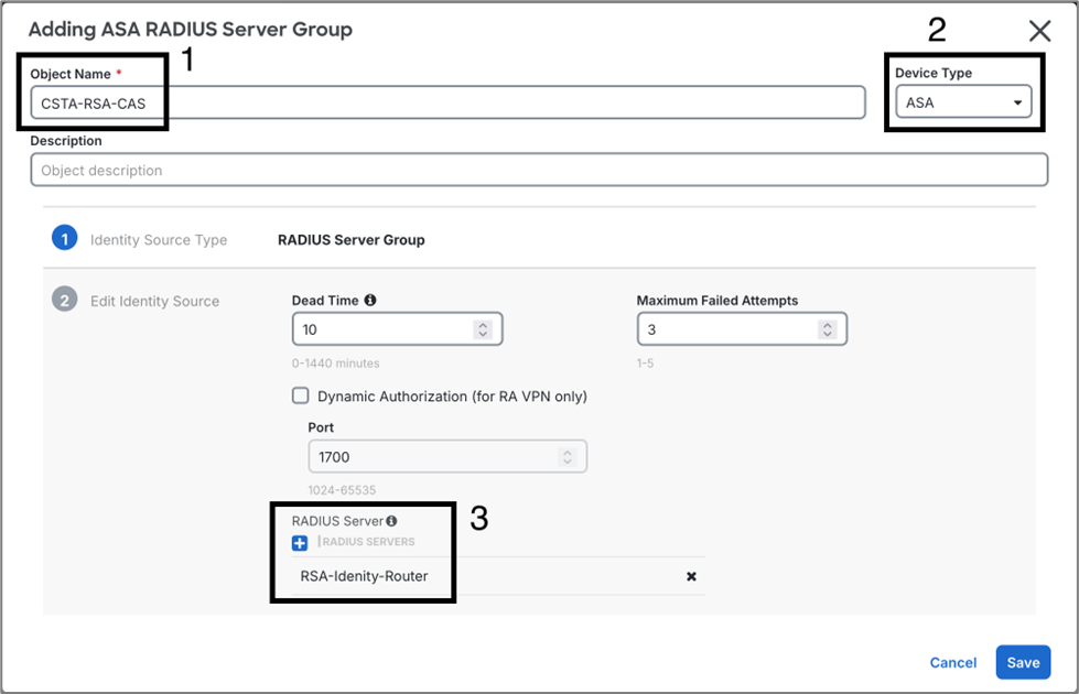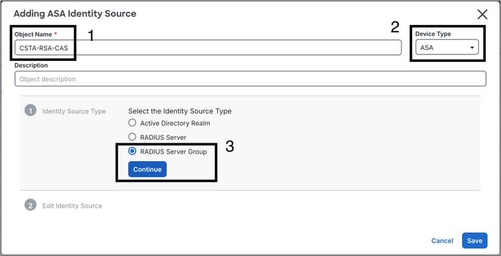 - Define the Object Name, select the Device Type as ASA, choose RADIUS Server Group, and click Continue to add a server to the group.