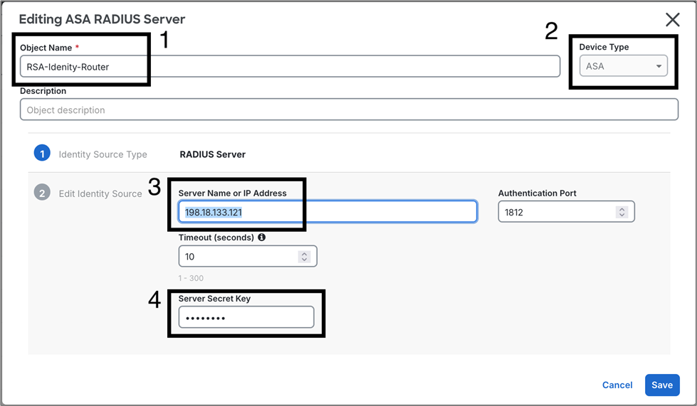 - Server Name or IP Address: Enter the Radius Server Name or management IP address of your RSA Identity Router.
