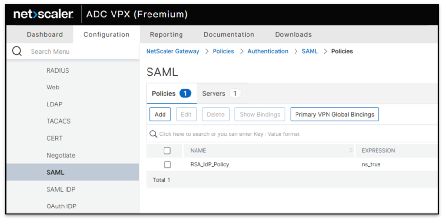 - Browse to Configuration > NetScaler Gateway > Policies > Authentication > SAML and click Add.