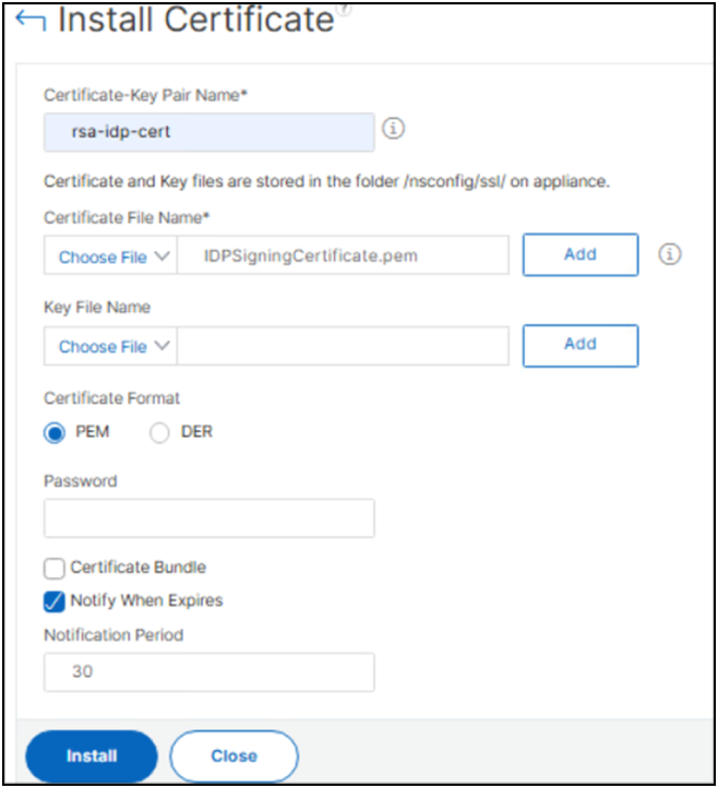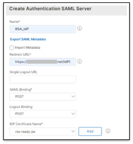 - In the IDP Certificate Name drop-down list, select the public certificate provided in the RSA Cloud Authentication Service configuration. If the certificate was not added, refer to the steps in the Notes section to add it.