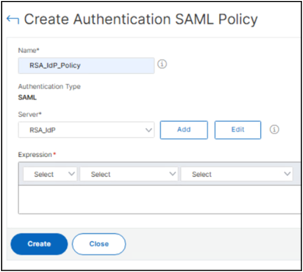 - On the SAML Authentication Policy page, type ns_true in the Expression field and click Create.