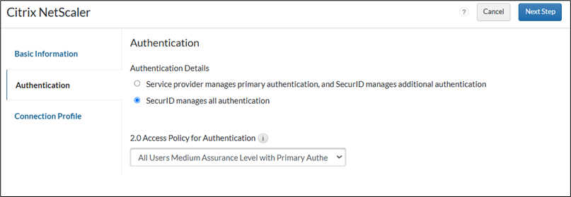 - On the Authentication page, choose SecurID Access manages all authentication.