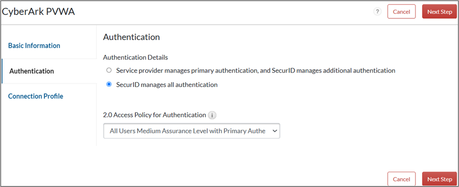 - On the Authentication page, choose SecurID Access manages all authentication.