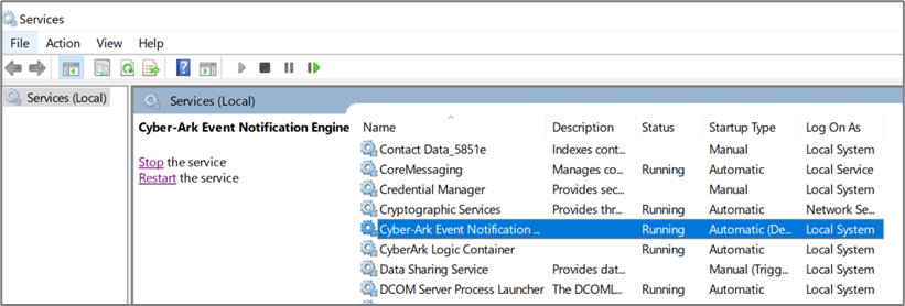 - Go to Run > services.msc and restart the PartnerArk service. Ensure the CyberArk Event Notification service is also started.