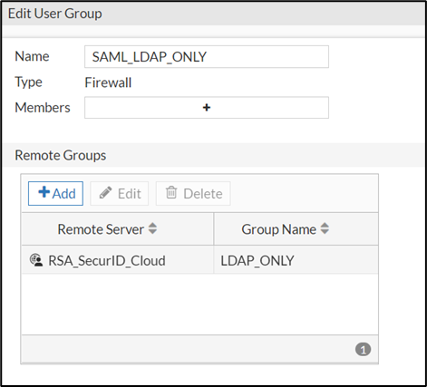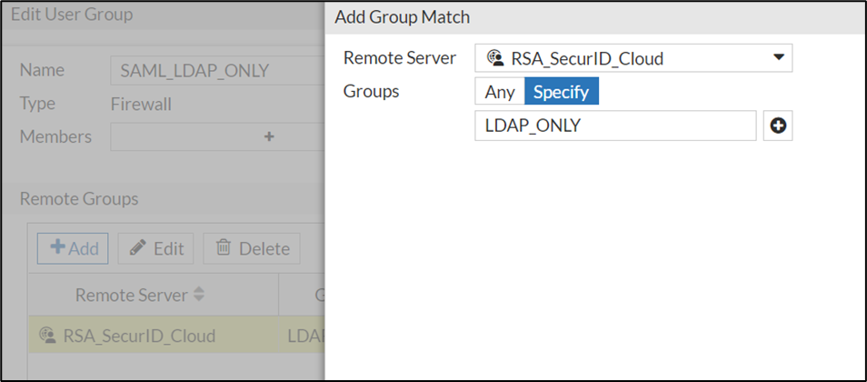 Note: You can match the returned group from RSA Cloud by clicking on the Remote Server above and specify the group you want to match, otherwise FortiGate will accept all groups by default.