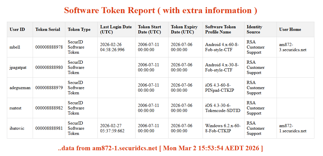 rsaadmin@am872:~> sudo su - [sudo] password for rsaadmin: am872:~ # cd /tmp am872:/tmp # ./RSAAM_token_rep.sh - Checking OC credentials.. - Missing OC credentials! - Please enter OC Administrator username: ocadmin - Please enter OC Administrator password: ** entered OC password received ** - OC credentials validated. - Generating HTML report... - NOTE: data is only written to the report where a software token has been distributed with a software token profile -- Report name : /tmp/RSAAM-token_report_202603021553.html - Done! am872:/tmp #Below is an example of the Software Token HTML report: