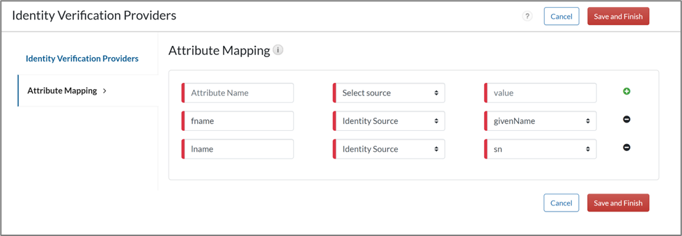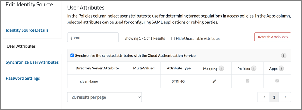 - Make a note of the attributes required by ID Dataweb workflow and identify the equivalent attributes in Identity Source in Cloud Authentication Service. For this use case, first name and last name attributes are sent.