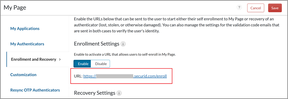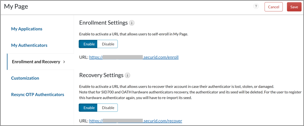 - My Page enrollment policy or My Page recovery policy under Access > My Page > Enrollment and Recovery tab must be enabled and configured.