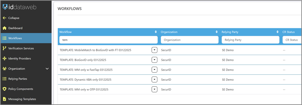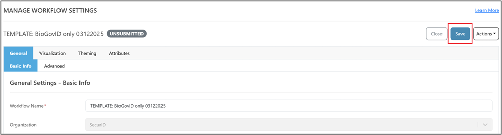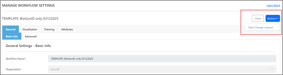- Click the drop-down arrow against the template for the desired workflow (in this instance, the workflow template of BioGovID is used) and select Open Workflow Details.
