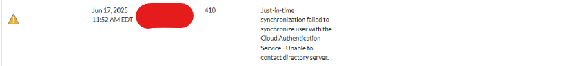 Jut-in-time synchronization failed to synchronize user with the Cloud Authentication Service - Unable to contact directory server.
