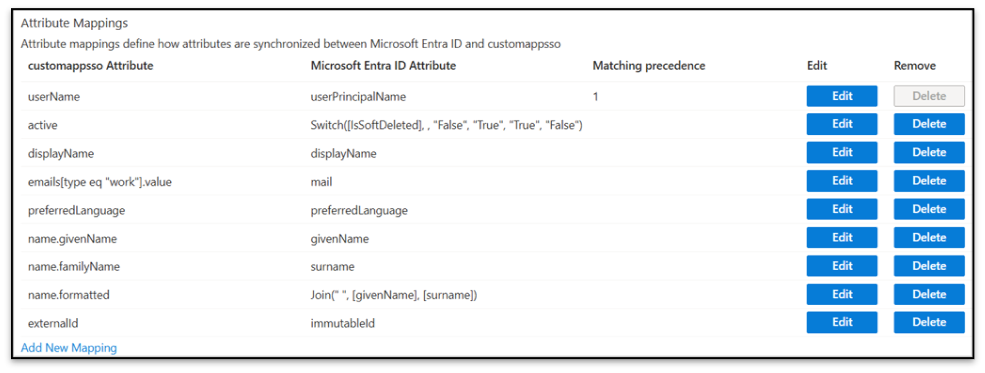 - In the Attribute Mapping section, map the attributes as shown in the figure. You can edit, delete, or create new mappings between Entra ID and RSA by clicking on each attribute.