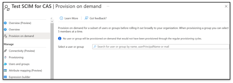 - To apply changes immediately, select Provision on Demand on the left pane and enter the user's name. Ensure the users are listed in the Users and Groups tab.