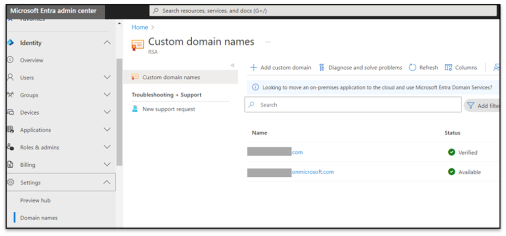 - In Identity > Settings > Domain names, ensure that the domain previously entered is listed on the custom domain names page. If not, click Add Custom Domain to verify your domain.
