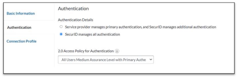 - On the Authentication page, select SecurID manages all authentication.