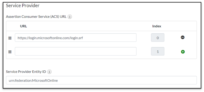 - Service Provider Entity ID: Enter the Microsoft Issuer "urn:federation:MicrosoftOnline".