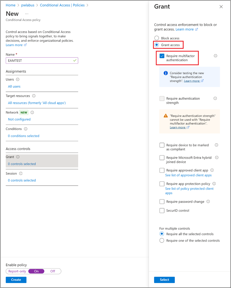 - On the resulting page, click Grant, choose Grant access, and select the Require multifactor authentication checkbox.