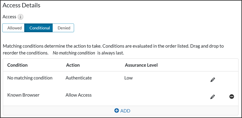 - If Access is selected as conditional ,click on Add button to reach Authentication Condition form .