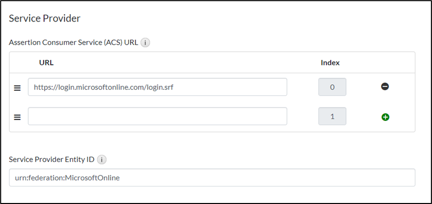 - Service Provider Entity ID: Enter the Microsoft Issuer "urn:federation:MicrosoftOnline".