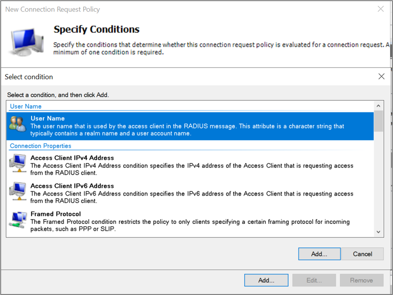 - Depending on the format of your user login names, enter the common element of the Username (For example, a pattern that matches the e-mail domain). This will signal to Microsoft NPS that usernames in this pattern will match that policy and hence these requests will be sent to RSA RADIUS Server for authentication.