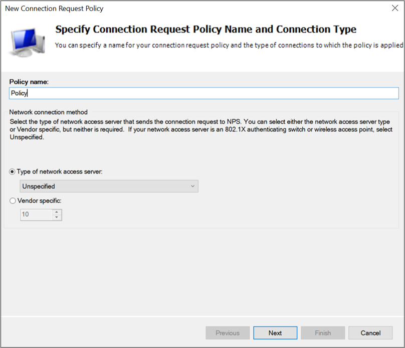 - Enter a name for Policy name and select the access server type of your deployment from in the Type of network access server drop-down list.