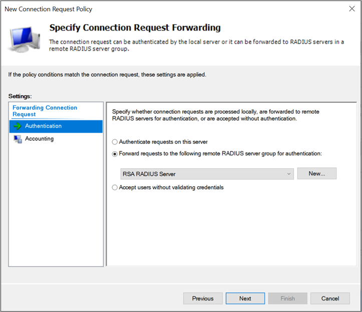 - Choose the Forward requests to the following remote RADIUS server group for authentication option.