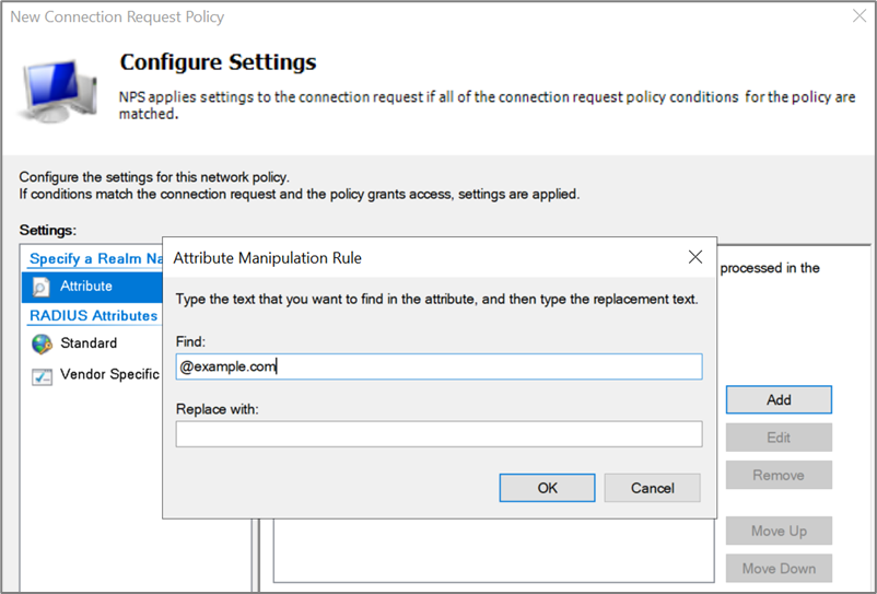 - For the Attribute Manipulation Rule, enter the common element of the Username in the Find field and leave the Replace with field blank.