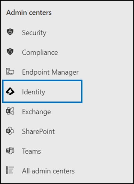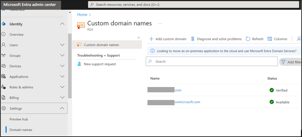- After your domain is verified, click Identity from the left panel. Microsoft Entra admin center page will open automatically.