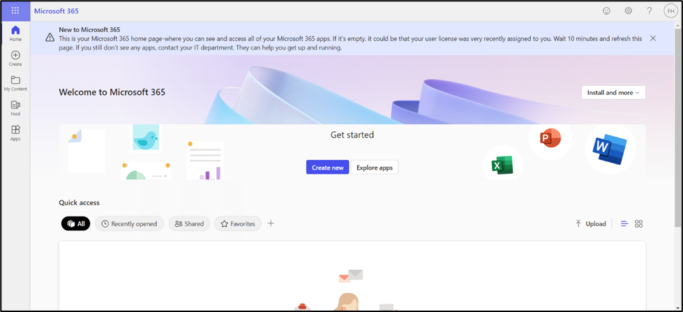 - After successful authentication, you will be redirected to your Office 365 landing page.