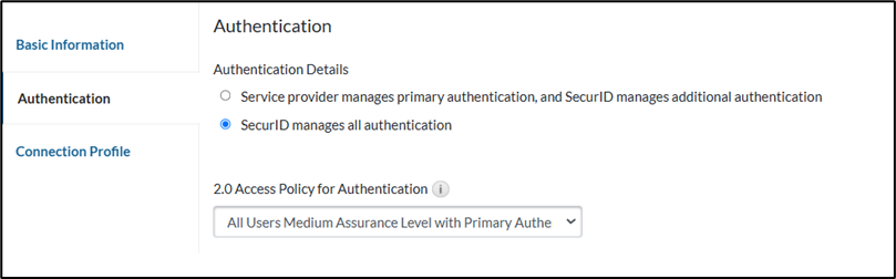 - On the Authentication page, select SecurID manages all authentication.