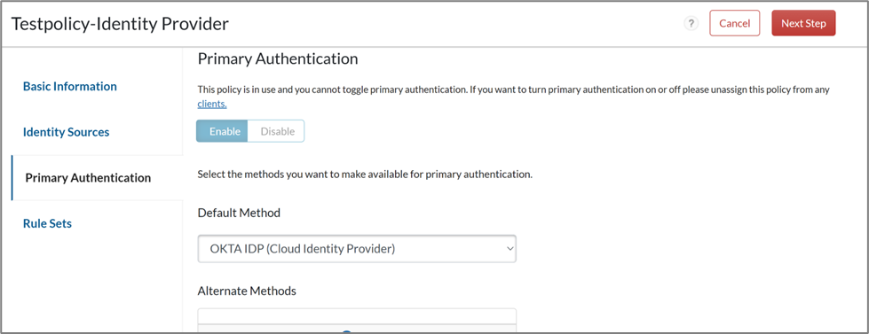 - On the Primary Authentication page, enable the Primary Authentication option and select the Okta Identity Provider that is created.