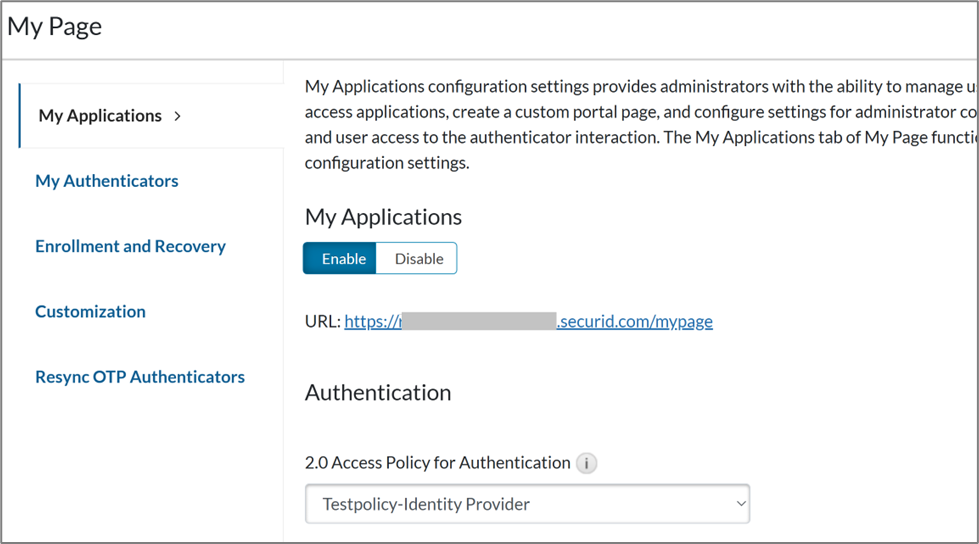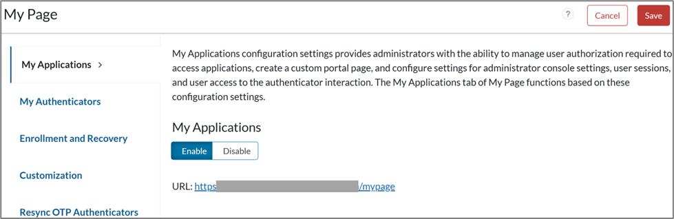 - Navigate to Access > My Page and ensure that the My Applications option is enabled. Users can use the displayed URL to access the self-service My Page portal.