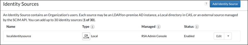 - Ensure that an Identity source is created in RSA Cloud Authentication Service under Users > Identity Sources or create a local one for testing purposes. Create a new user in the local identity source. This user will be able to access the My Page portal.