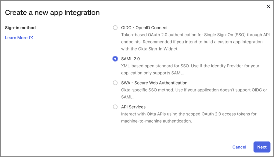 - Select SAML 2.0.