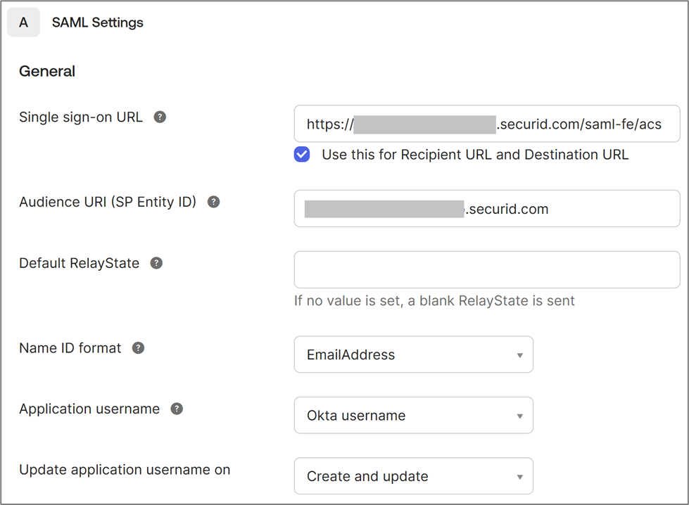 - Audience URI (SP Entity ID): Enter the value of the Audience ID that was copied from RSA.