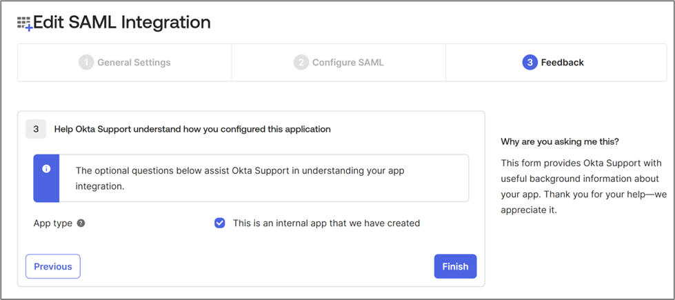 - Select the This is an internal app that we have created checkbox and click Finish.