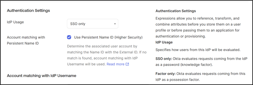 - Select IdP Usage as SSO only and select the checkbox for Account matching with Persistent Name ID.