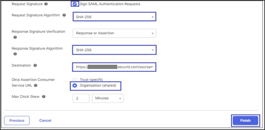 - Request Signature Algorithm select the SHA-256 from the drop down list.