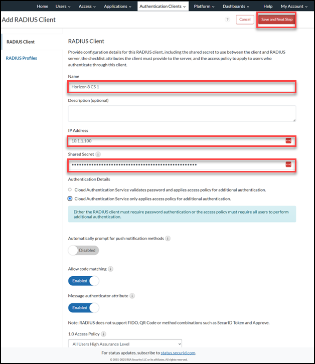 Perform the steps in this section to configure the RSA Cloud Authentication Service for Horizon 8 Connection Servers using RADIUS.