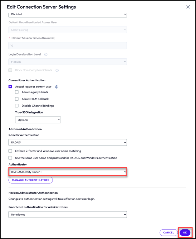 - Repeat step 10 for each Horizon 8 Connection Server you wish to enable for RSA SecurID.