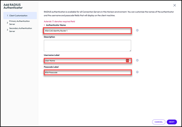 Note: The “Username Label” and “Passcode Label” fields provide the end-user a hint to place their passcode in to the Horizon Client upon log in.