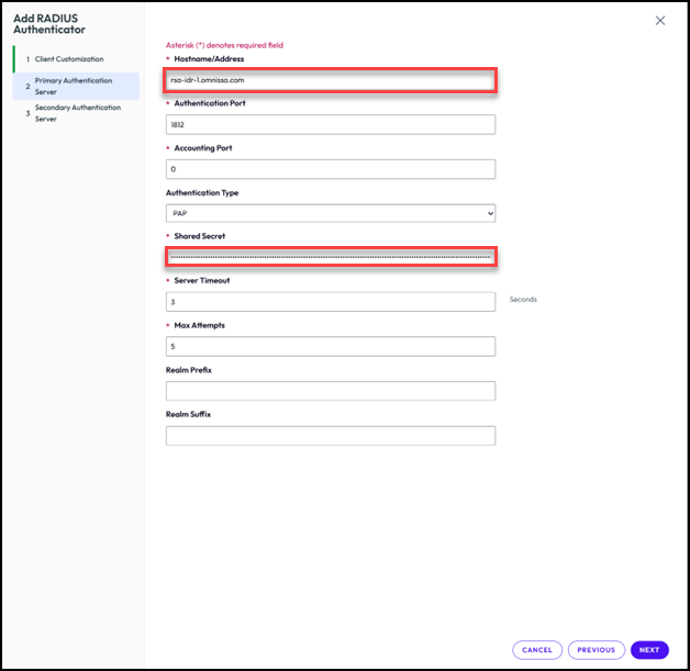 - On the Primary Authentication Server page, provide Hostname or IP Address of the RSA Identity Router management interface and the Shared Secret as well as any other necessary fields. Click Next.